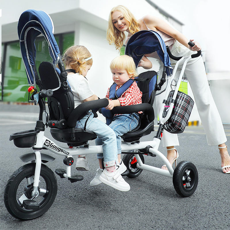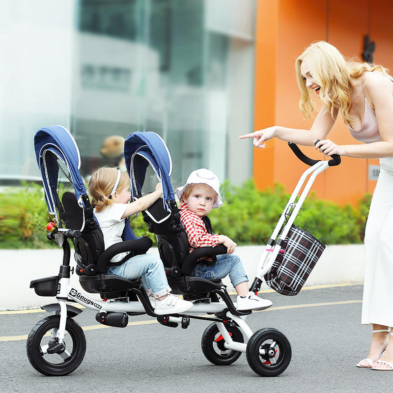 Hafron Twin Tricycle Double Seat Pedal Stroller For 1-5 Years Steel Frame Hand Push Kids Ride On With Canopy