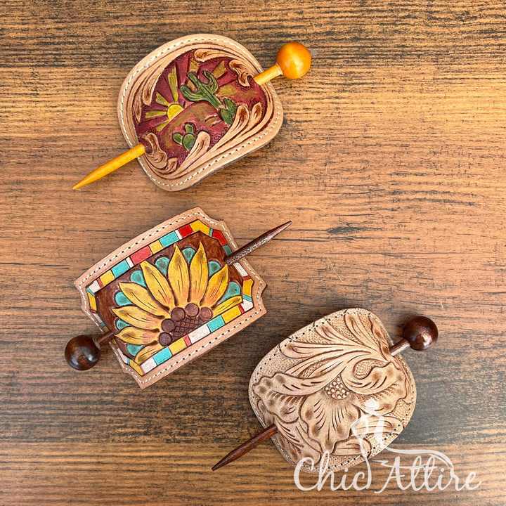 Hair Accessory for Women Designer Hand Tooled Leather Hair Barrette with Wooden Stick Cowhide Leather Hair Slide Barrette Clips