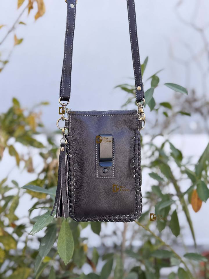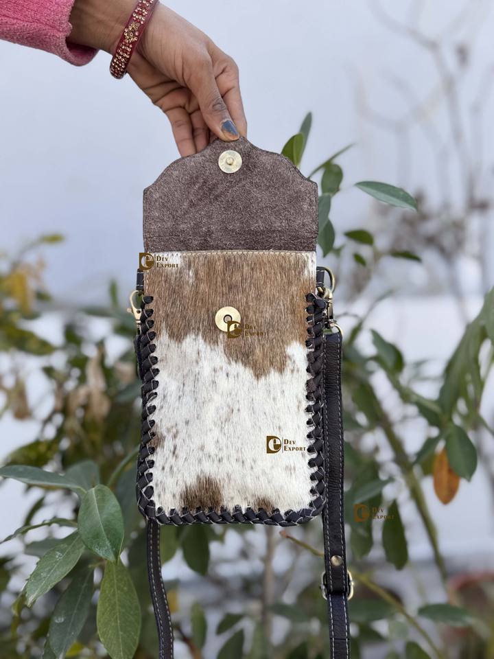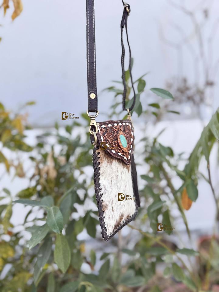 Hair On Hide Fur Leather Hand Tooled Carving Turquoise Stone Sling Leather Bag Small Size Phone Purse and Handbag Wristlet Pouch