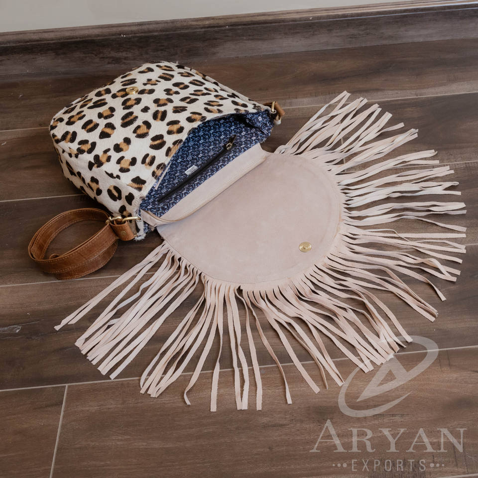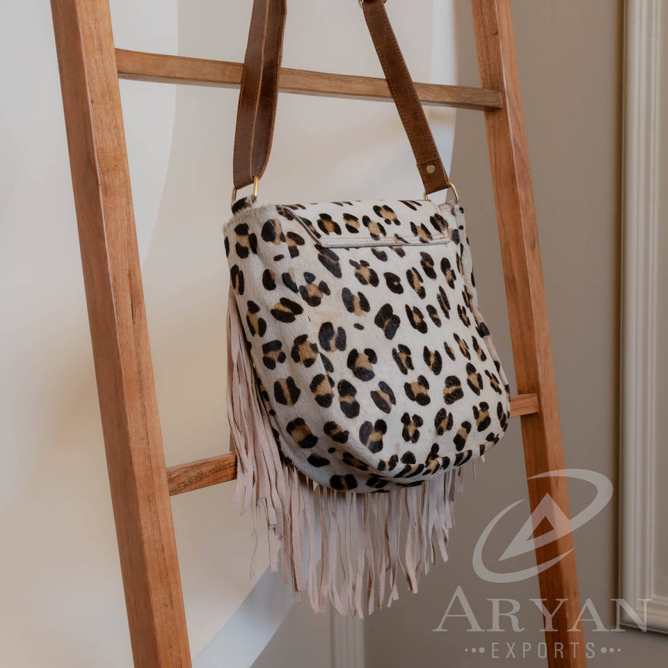 Hair on Animal Print Suede Leather Fringe Cowhide Crescent Purse Women's for Fashionable Hot Selling Barrel Shaped Crossbody Bag