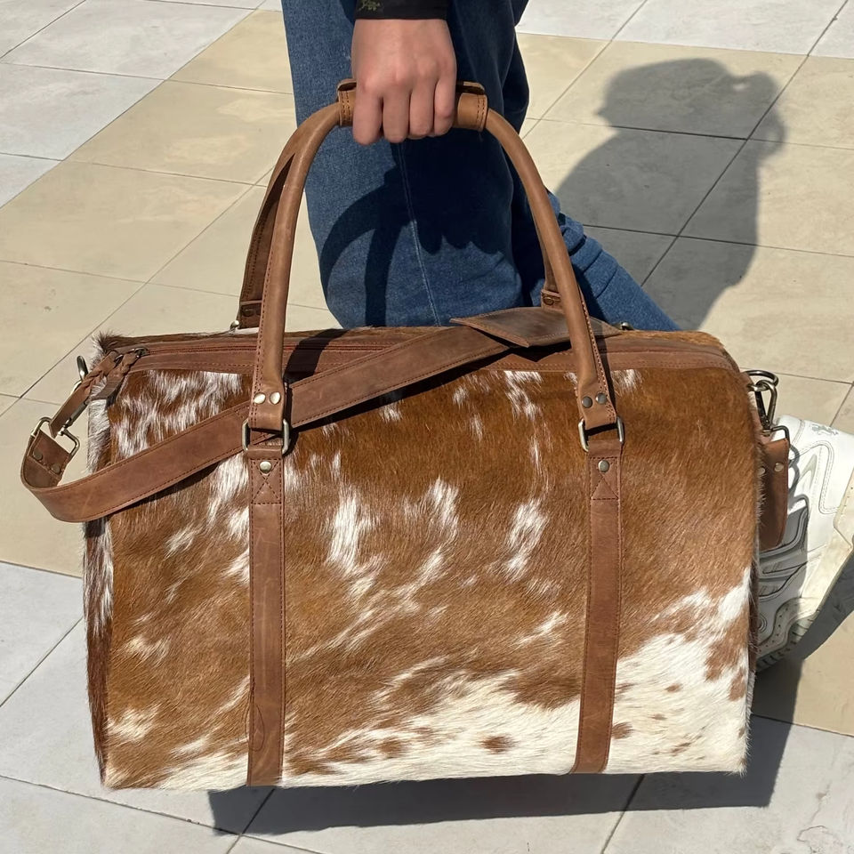 Hair on Leather Duffle Bag Genuine Cowhide Vintage Fashion Zipper Portable Travel Luggage Large Capacity Weekender LHDB-0012