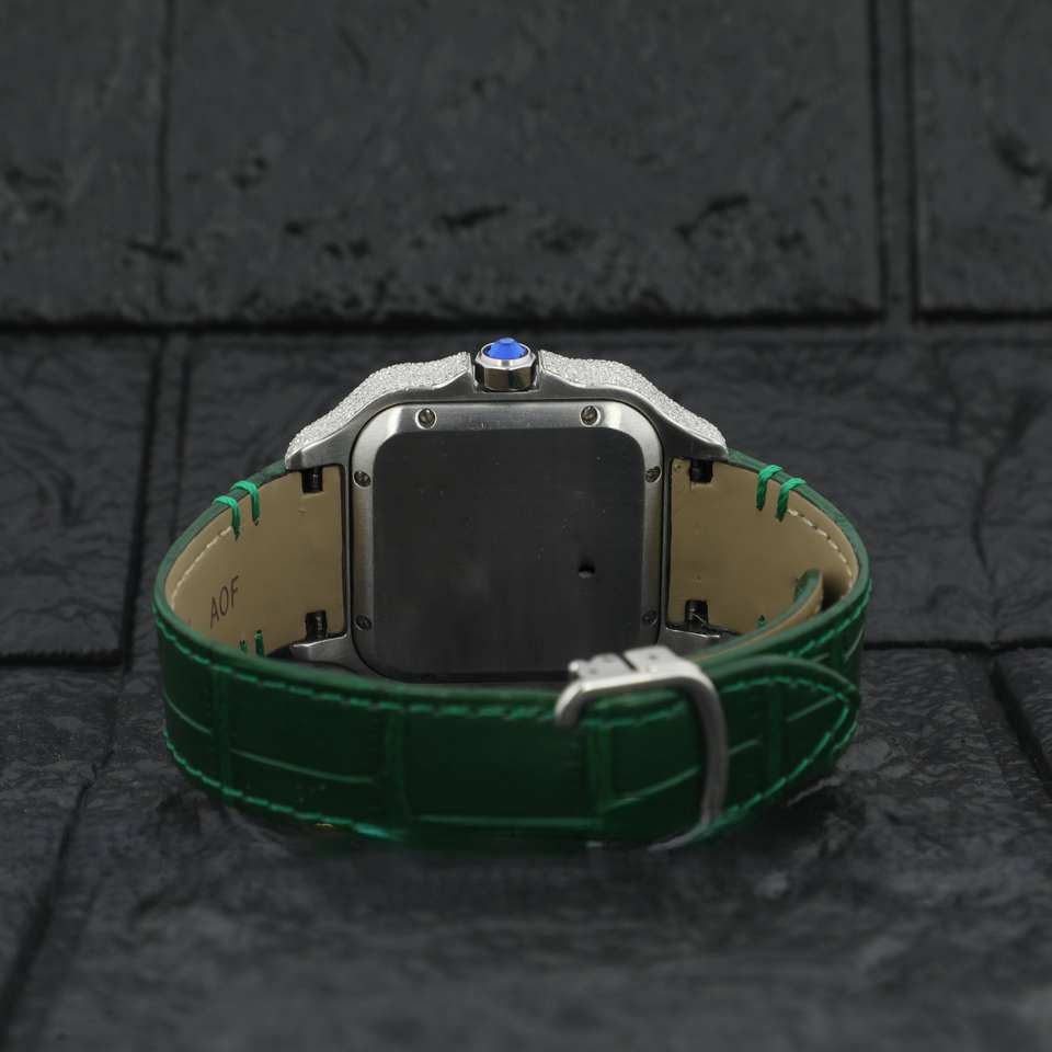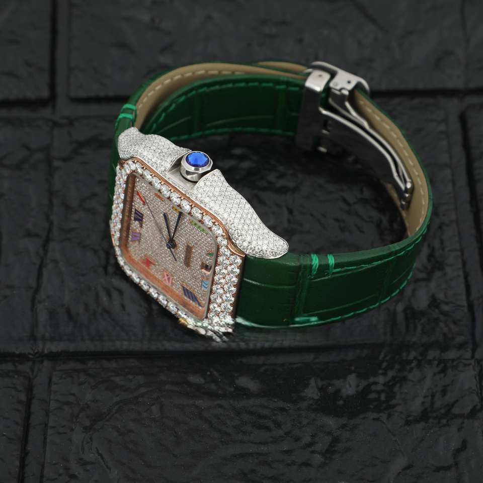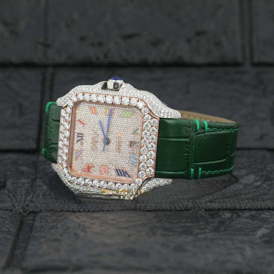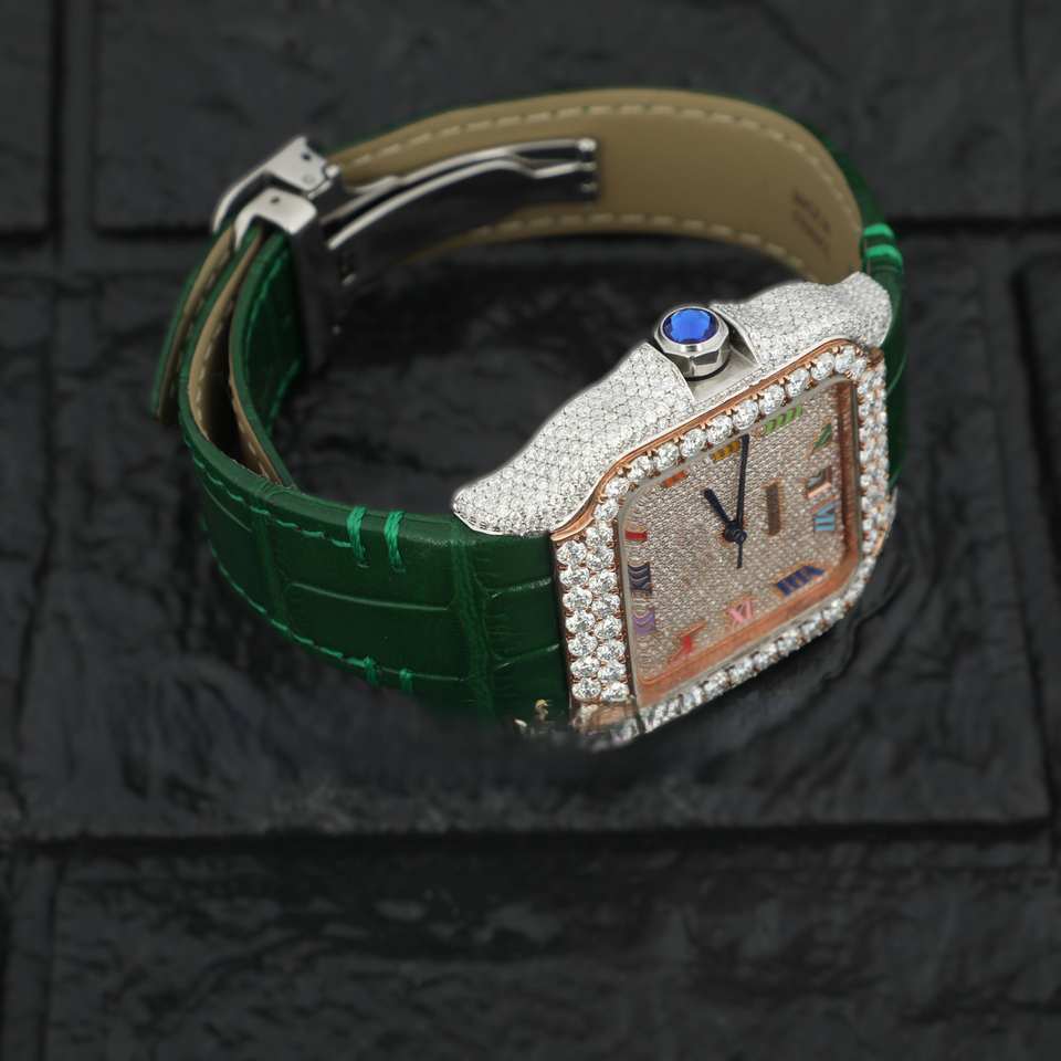 Half Iced Out Luxurious Moissanite Diamond Studded Watch Green Leather Band Roamn Numeral Dial Date Function for Men and Women