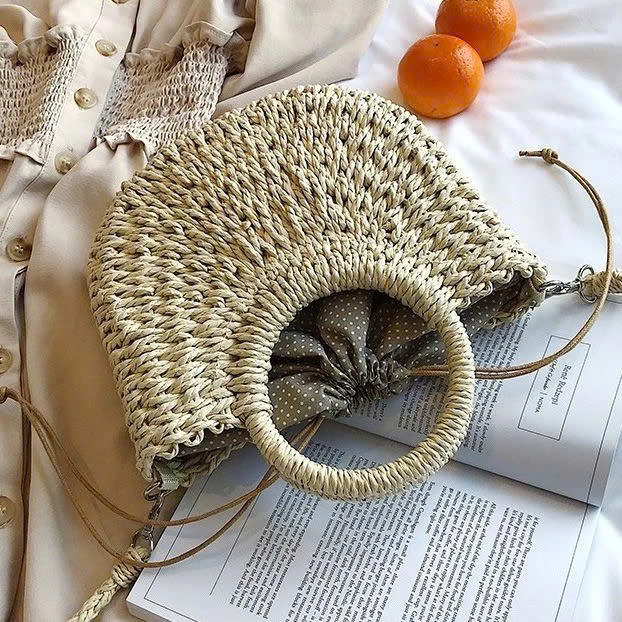 Half Moon Handwoven Seagrass Bag with Large Lace Bow Elegant Drawstring Straw Shoulder & Handbag for Women