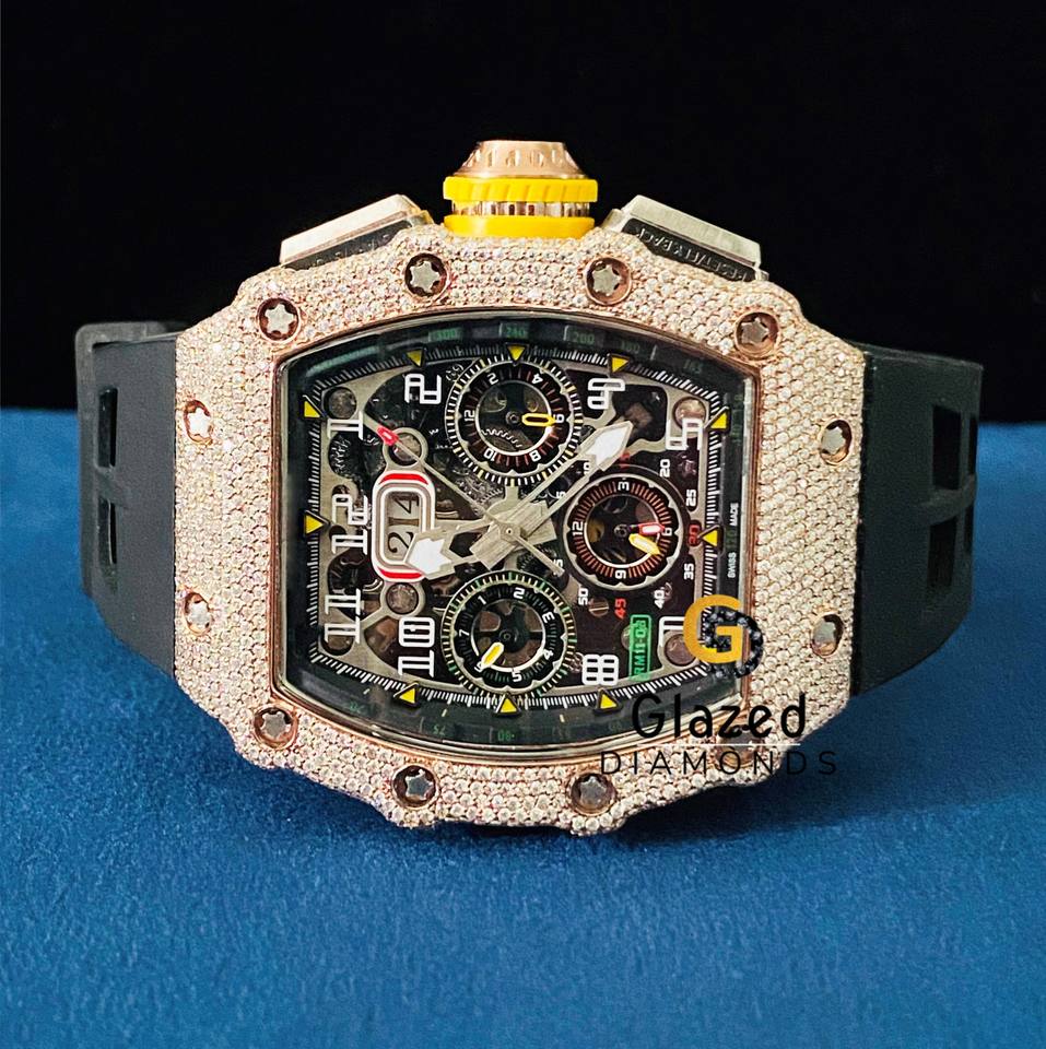 Half-Studded Hip Hop Skeleton Chronograph Watch with Round Cut Moissanite Black Rubber Belt Analog Glass Dial Display