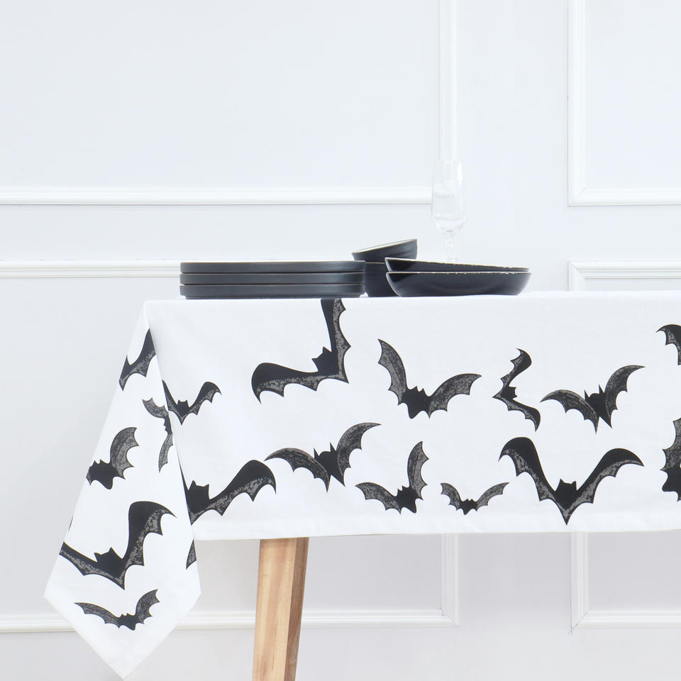Halloween Party Decor Modern White & Black Square Tablecloth 52x52 Inch Machine Washable Cotton with Printed Bat Pattern
