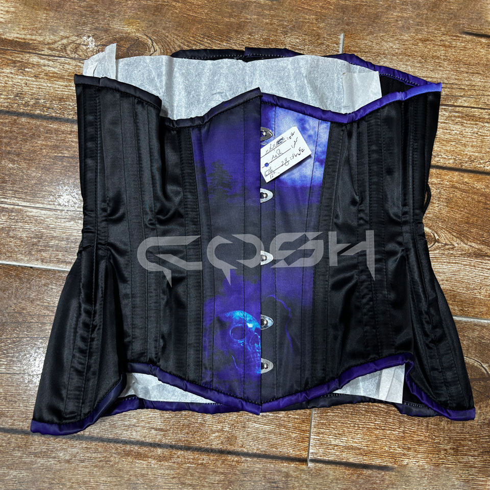 Halloween Punk Black and Blue Gothic Skull Printed Satin Corset Steampunk Underbust Waist Training Corset Supplier