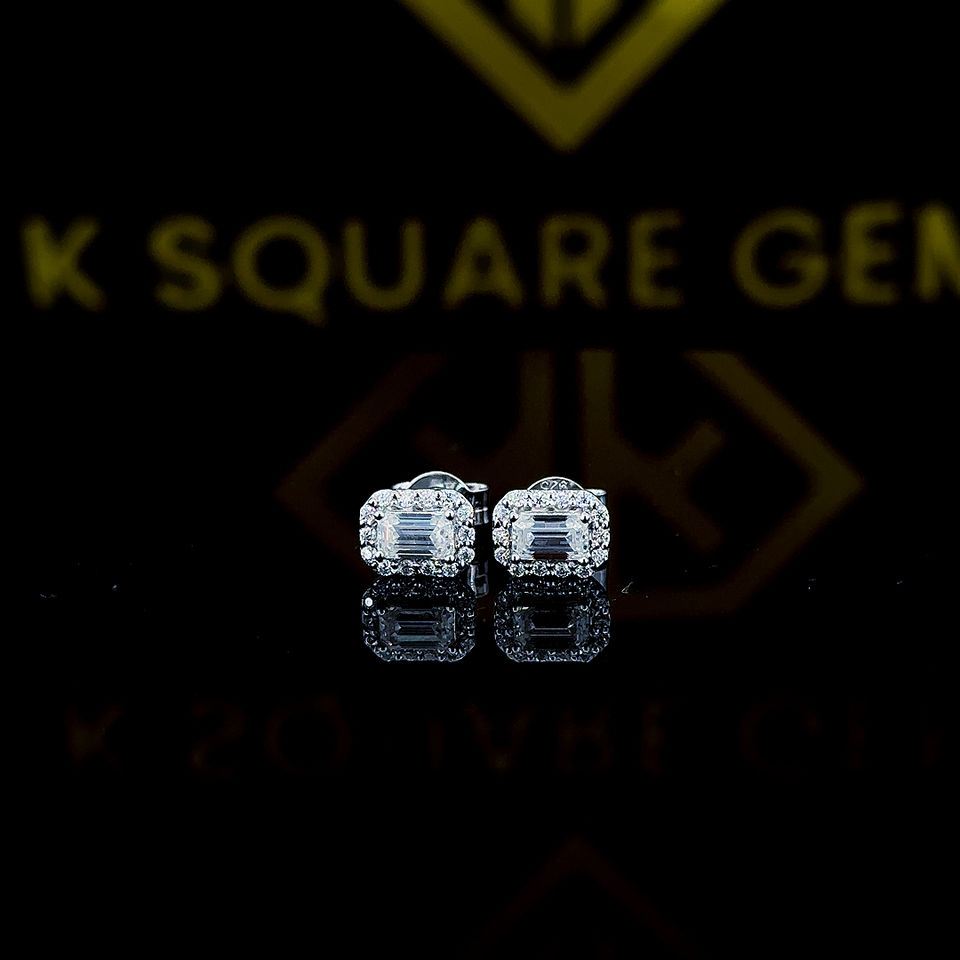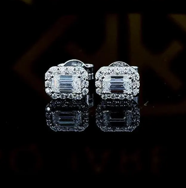 Halo Emerald Cut Moissanite Earrings, Emerald Stud Earrings, Push Back Earrings, Wedding Earrings for Women, 10k White Gold