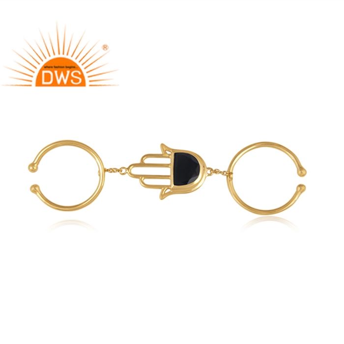 Hamas Design Double Band Chain Finger Ring Yellow Gold Plated Silver Ring Wholesaler Black Onyx Gemstone Ring Jewelry