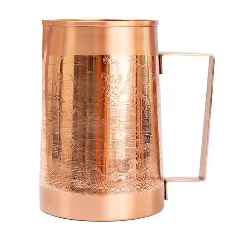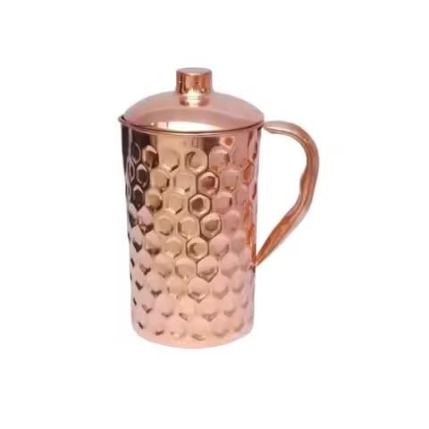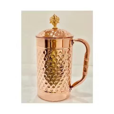 Hammered Finished Copper Jug With Lid & Brass Knob Handle & Base for Serving Water Home Kitchen Use