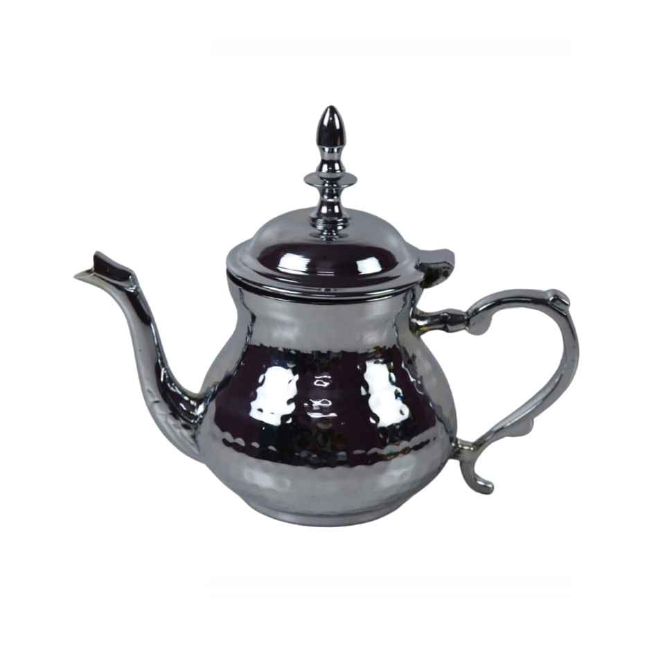 Hammered Silver Teapot with Rounded Body Curved Spout Ornate Handle Decorative Lid Finial Polished Finish Handcrafted