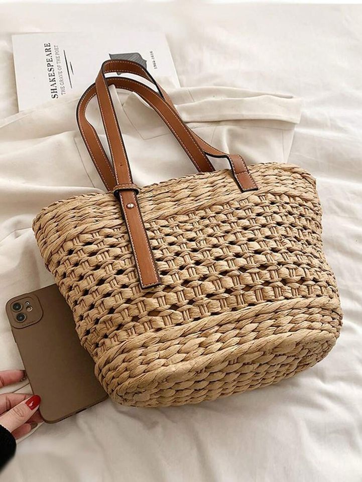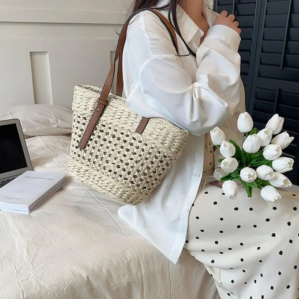 Hand Bag with Leather Handles Women Straw Travel Beach Totes Woven Summer Handmade Good Quality Shoulder Bag From Vietnam