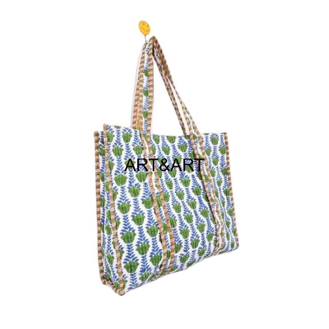 Indian Hand Block Printed Quilted Women's Summer Fashion Tote Shopping Carry Shoulder Bag Multi-Color Floral Print Cotton Two