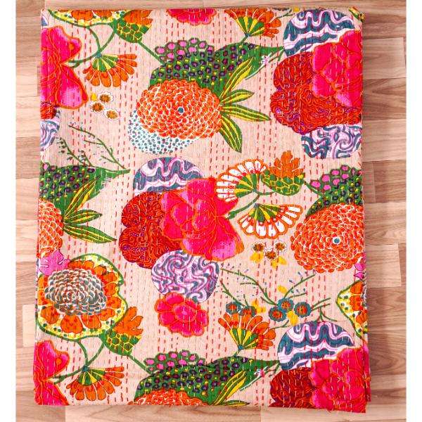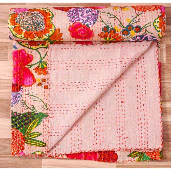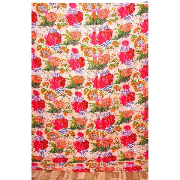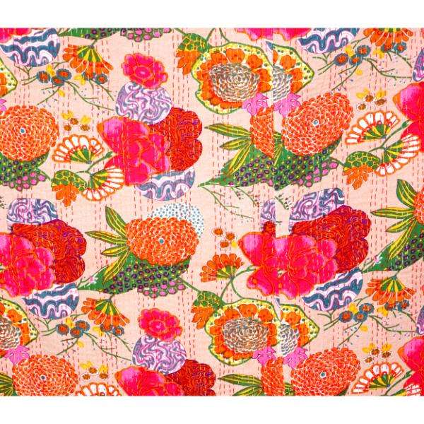 Hand Block Kantha Quilt Indian Hand Printed Floral King Kantha Quilt Single Pure Cotton Kantha Bohemian Bed Cover Bedspread