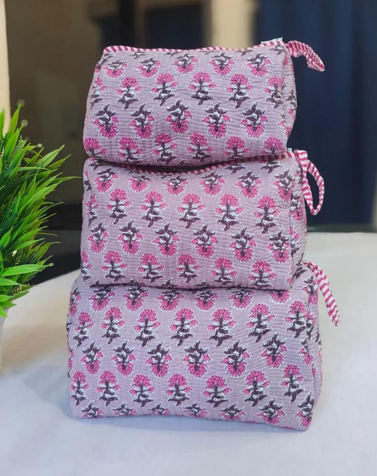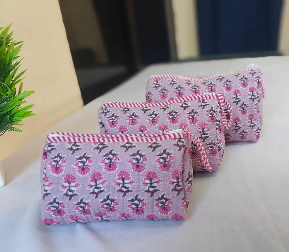 Hand Block Print Eco-Friendly Vintage Cosmetic Bag Set Large Capacity Quilted Cotton Zipper Closure Case with Floral Design