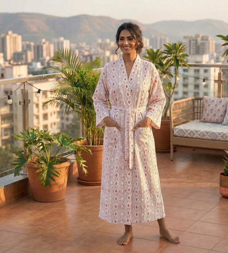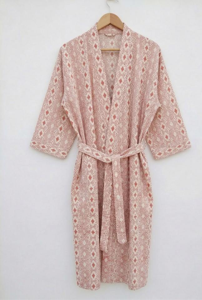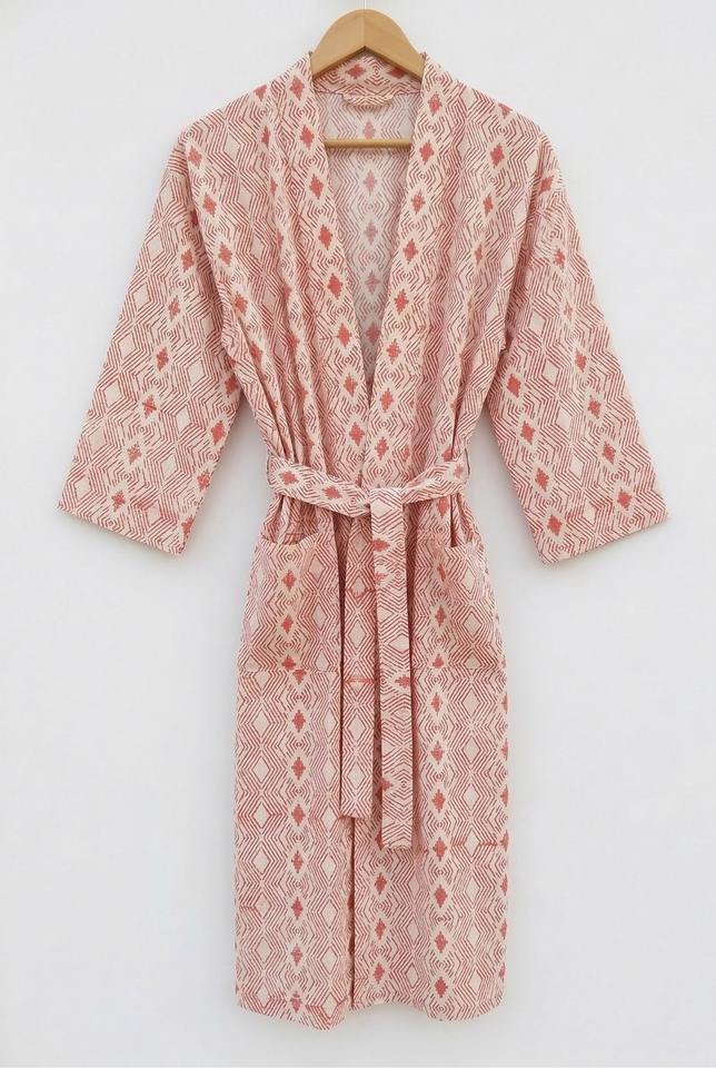 Hand Block Print Cotton Kimono Robe Women Soft Stand Collar Luxury Nightgown All Season Lounge Wear