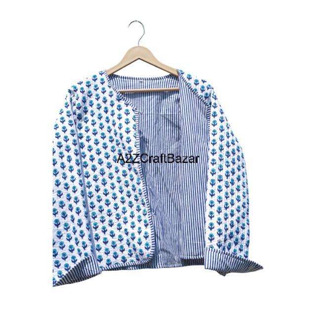 Hand Block Print Reversible Short Jacket Floral Pattern Quilted Cotton Outerwear Made in India-Casual Outerwear
