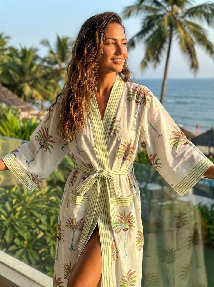 Hand Block Print Palm Tree Cotton Kimono Robe For Women Green Trim Indian Cotton Dressing Gown Lightweight Lounge Bathrobe