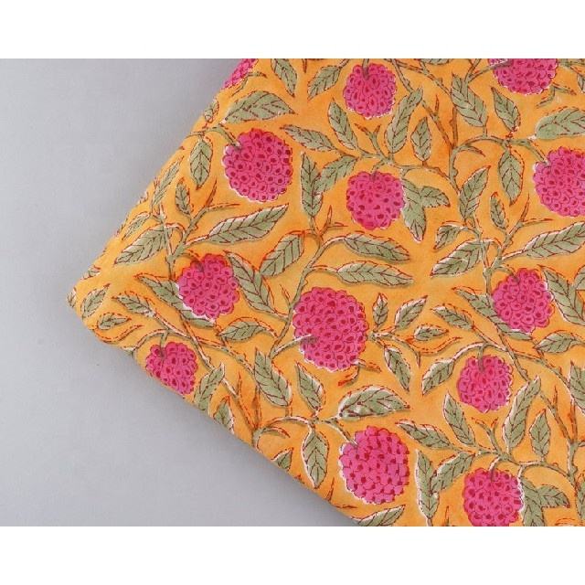 Hand Block Print Running Sewing Fabric Scarves Decorative Fabric Floral Mustard & Pink Cotton Fabric