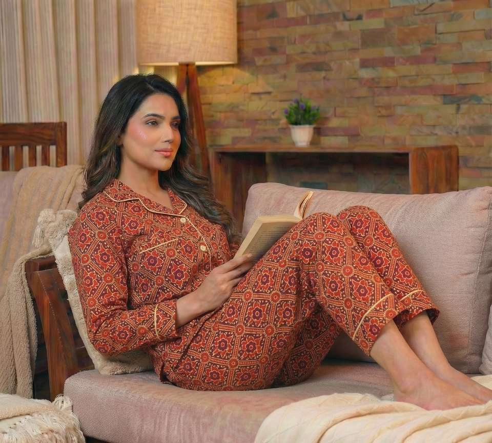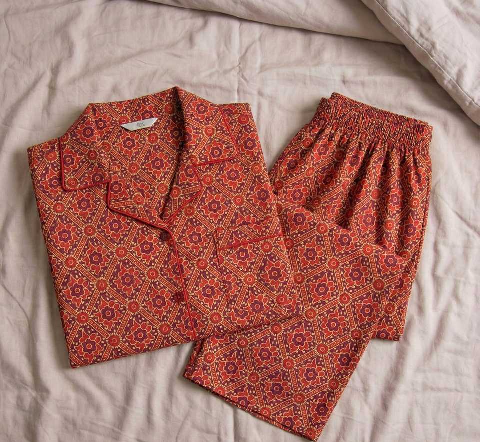 Hand Block Print Woven Cotton Thermal Summer Women's Floral Long Sleeves Machine Embroidery Pajama Set with Pockets Gifting