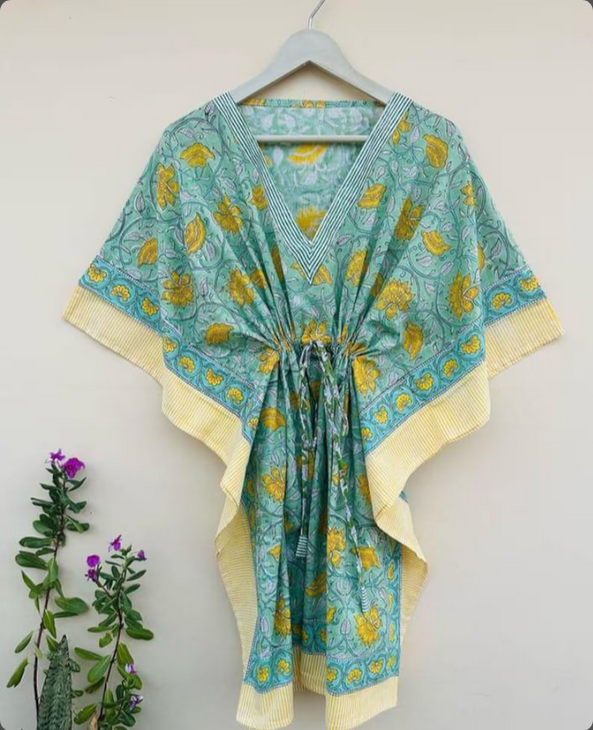 Hand Block Printed 100% Natural Cotton Kaftan for Women Summer Night Wear Beach Cover Ups Bikinis & Beachwear