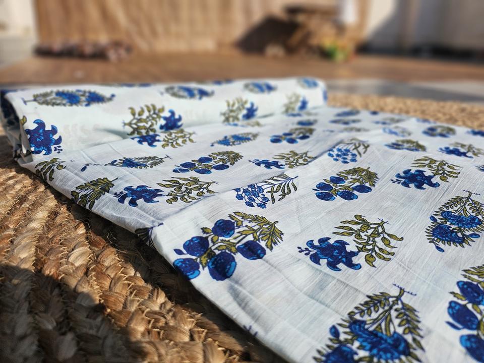Hand Block Printed Blue Floral Cotton Fabric Custom Print Ideal for Home Decor Clothing and Manufacturing Use