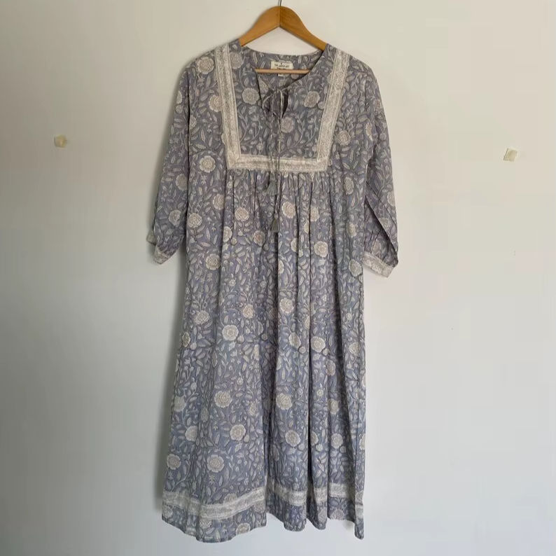 Hand Block Printed Blue Floral Cotton Midi Dress Bohemian Summer Wear