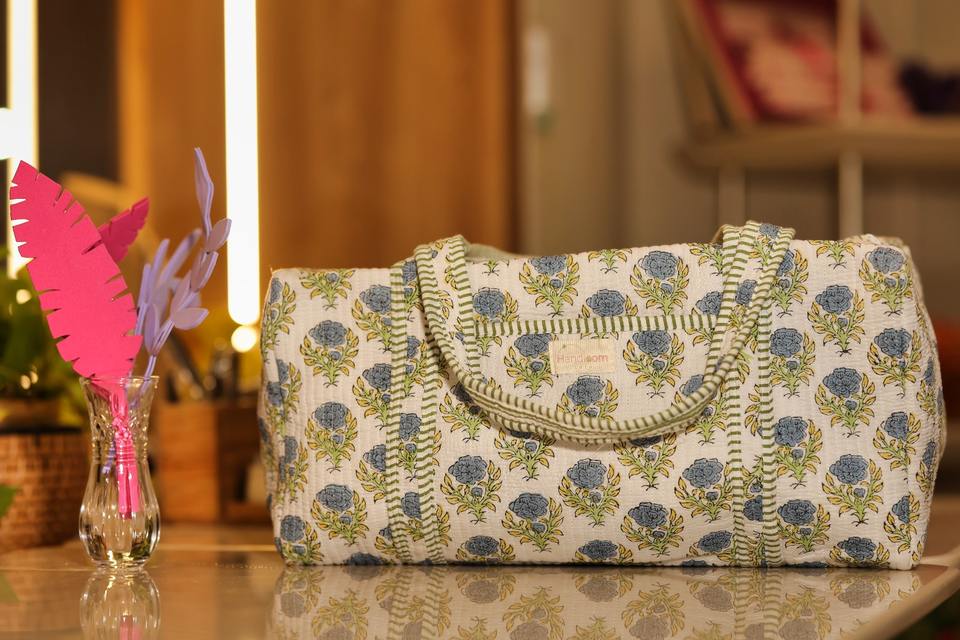 Hand Block Printed Cotton Duffel Bag Blue Floral Motif Handmade Eco-Friendly Fabric Large Capacity Durable Travel Tote Bag
