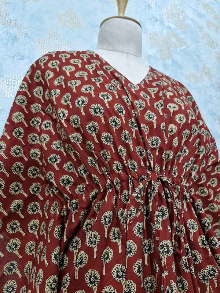 Hand Block Printed Cotton Kaftan Dress Maroon Floral Boho Lounge Wear