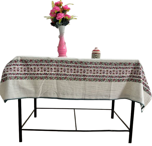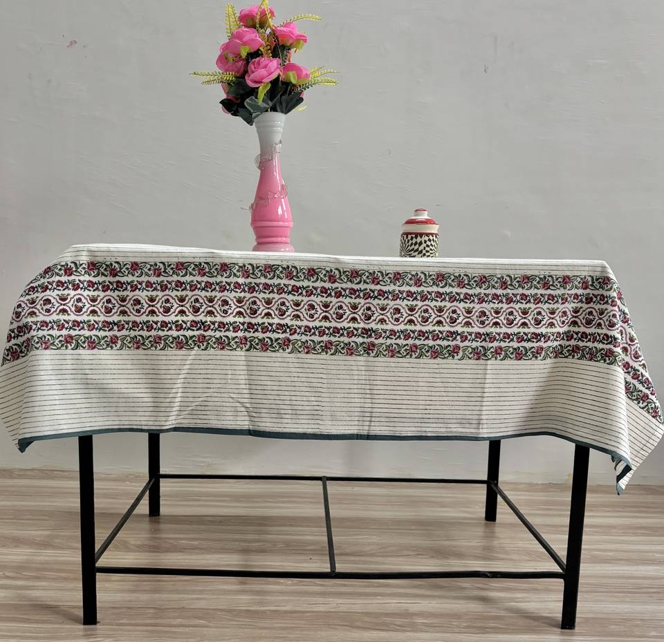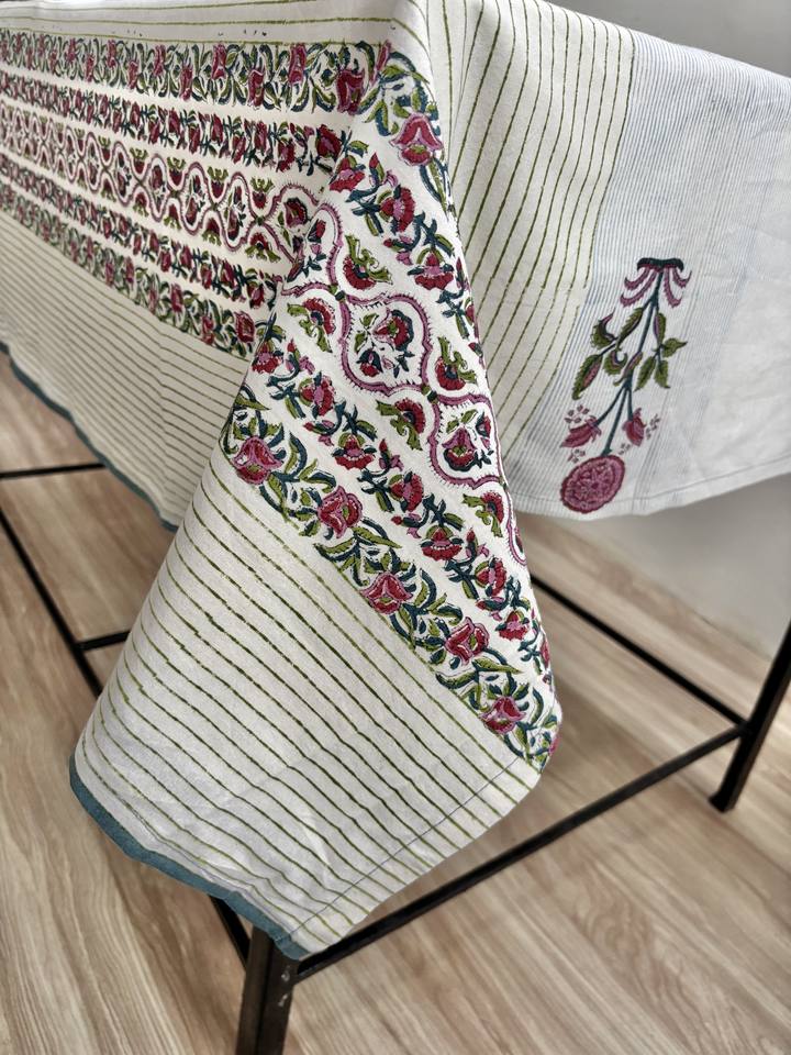 Hand Block Printed Cotton Tablecloth: Floral Stripes, Boho Dining
