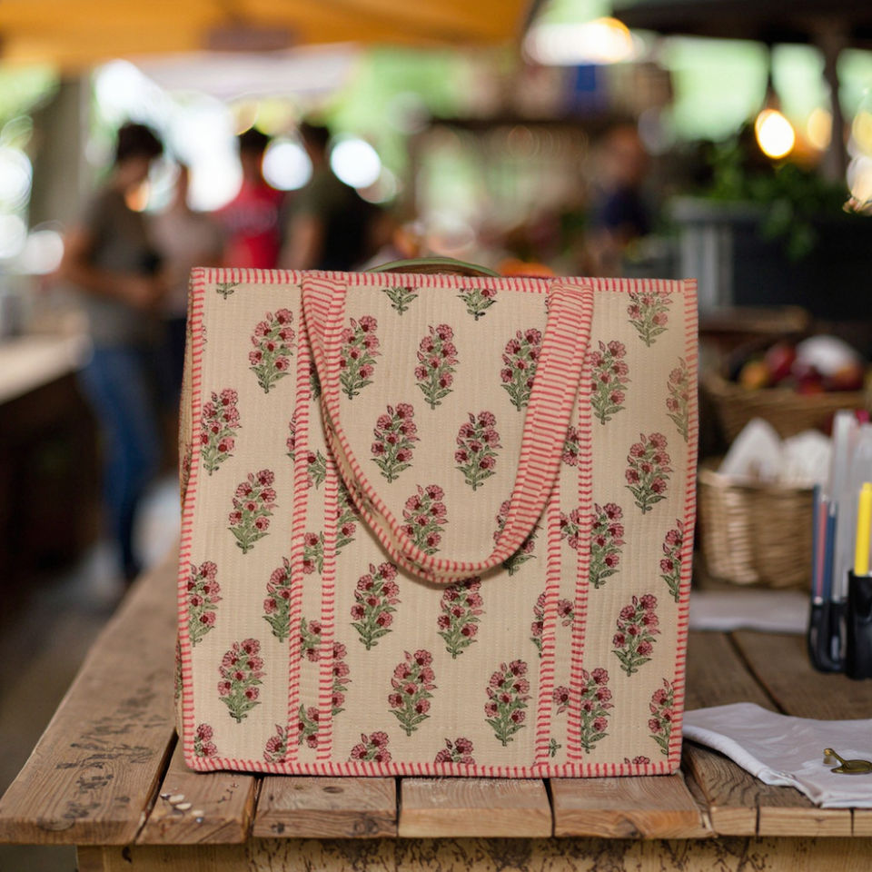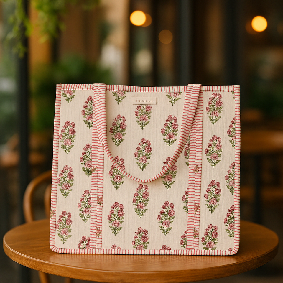 Hand Block Printed Cotton Tote Bag Quilted Fabric Handmade Eco Friendly Durable Lightweight Large Capacity Travel Shopping Bag
