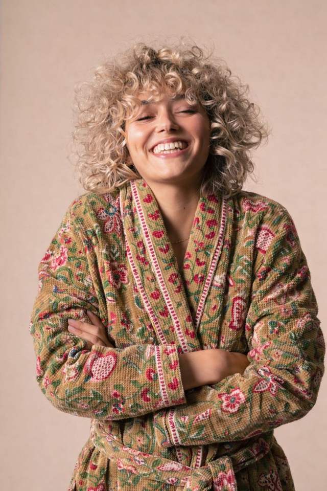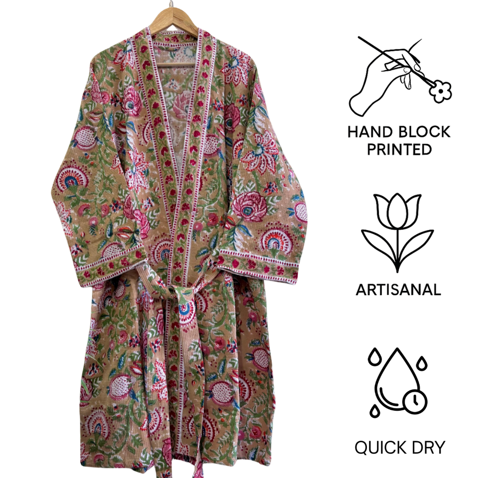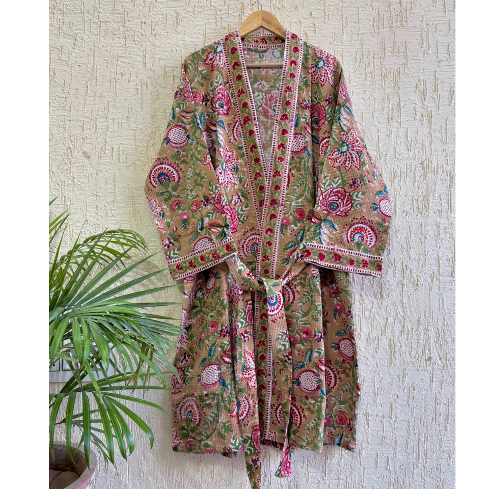 Hand Block Printed Compressed Floral Cotton Waffle Bathrobe Luxury Spa Robe Eco-Friendly Quick-Dry Private Labels Wholesale OEM