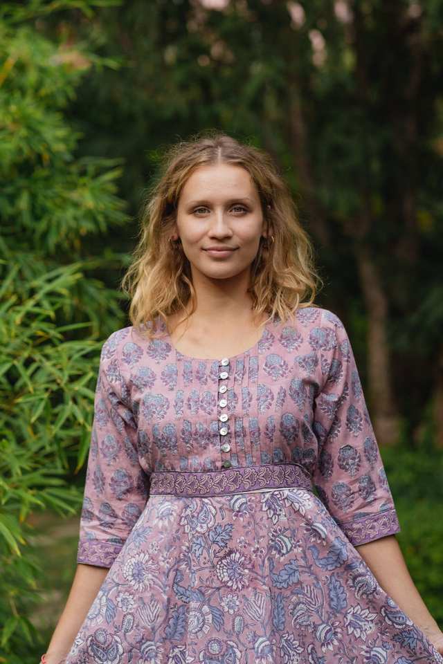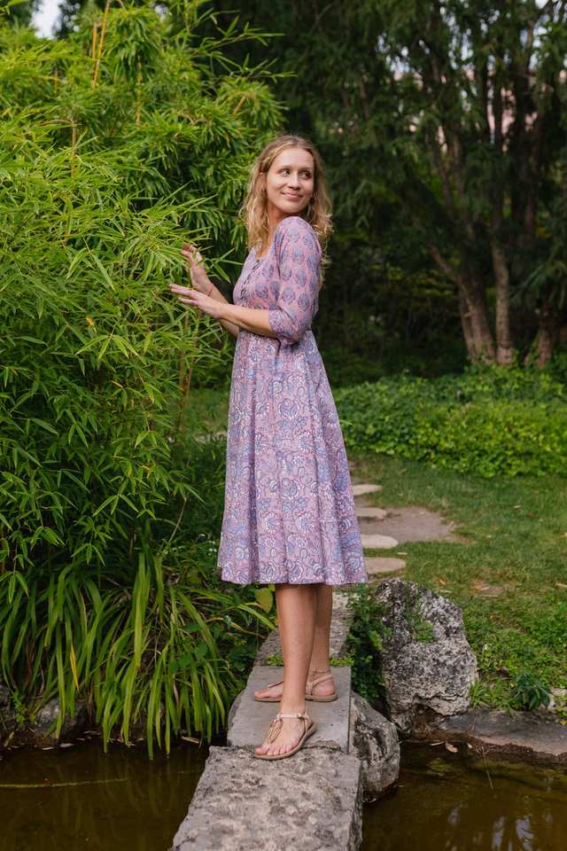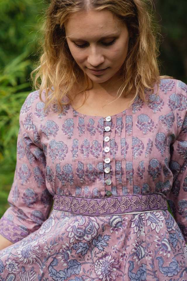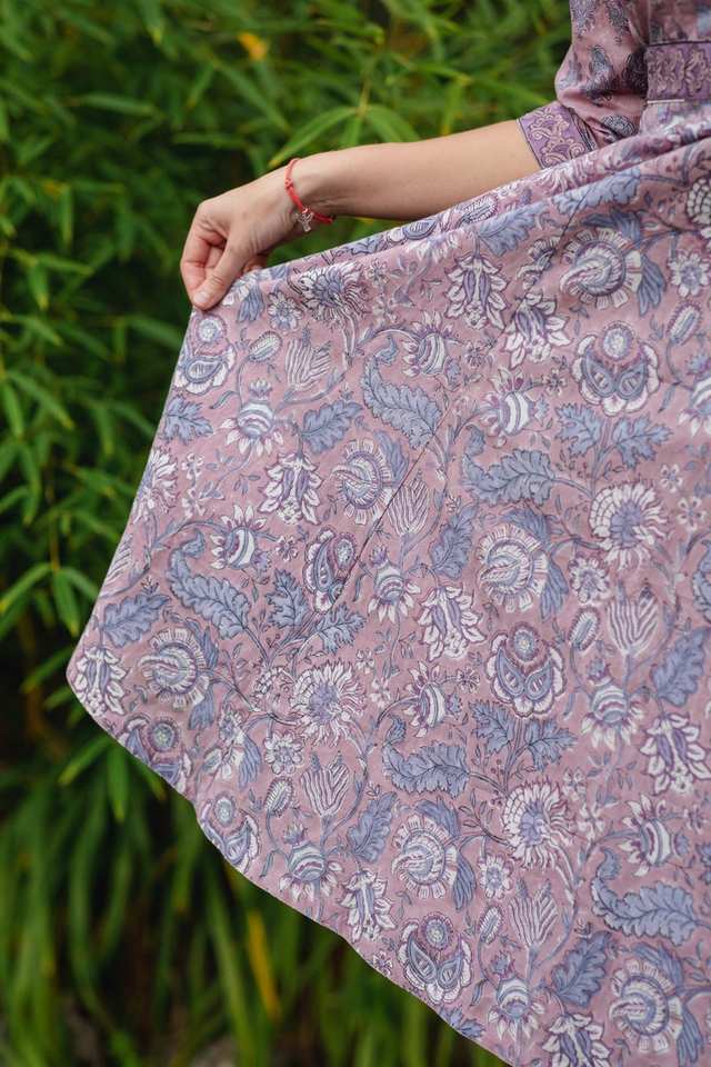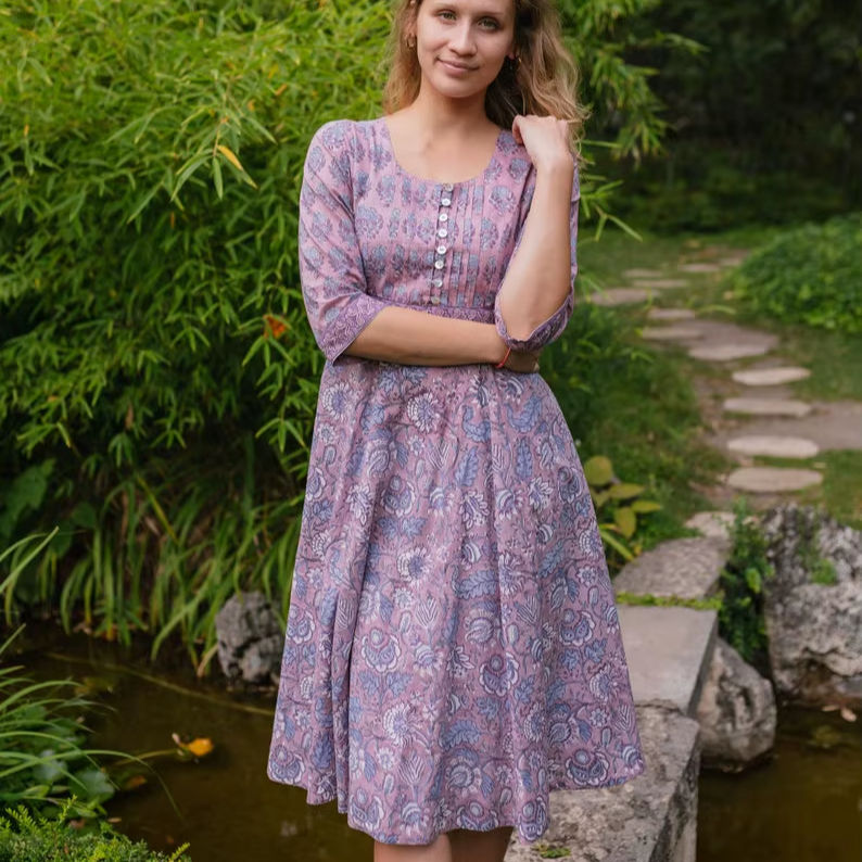 Hand Block Printed Hladini Dress Bohemian Calf Length Floral Purple Blue Handmade