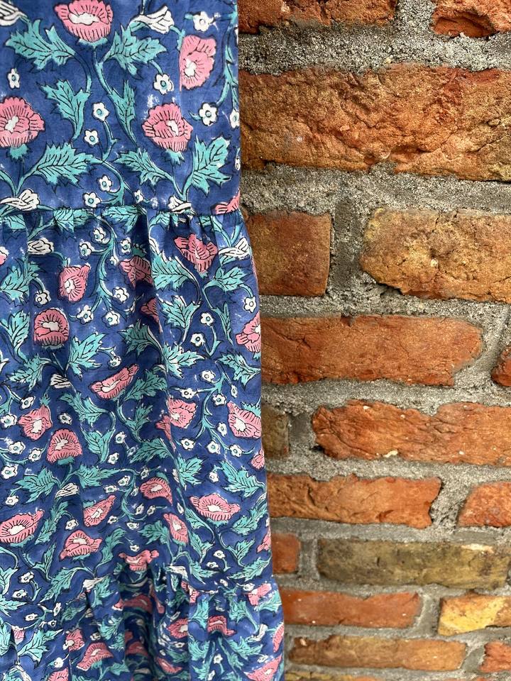 Hand Block Printed Indian Cotton Dress 100% Cotton Long Gown with Floral Embroidery Square Collar Tunics