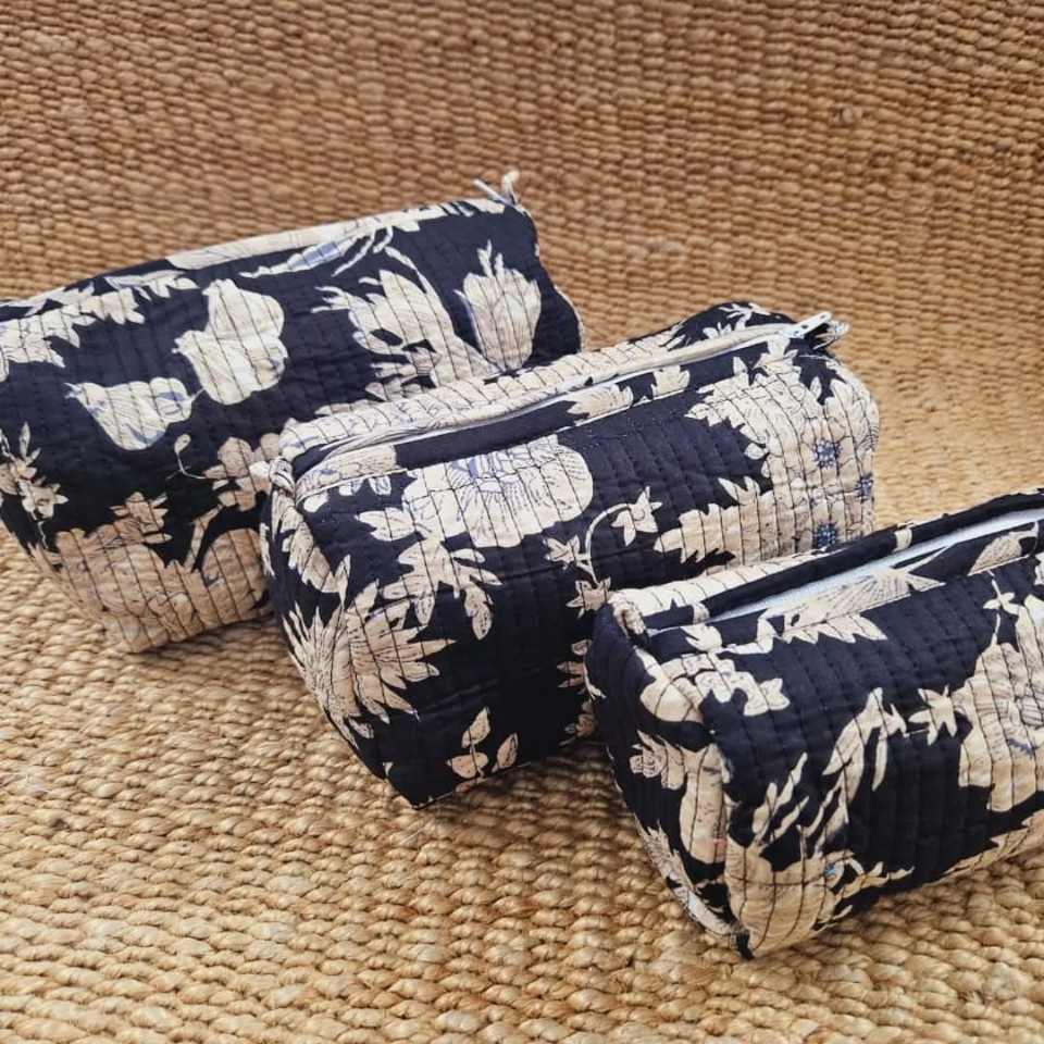 Hand Block Printed Kantha Quilted Toiletry Pouches With Zip Closure Floral Printed Cotton Fabric Bag for Women Cosmetic Bag Set