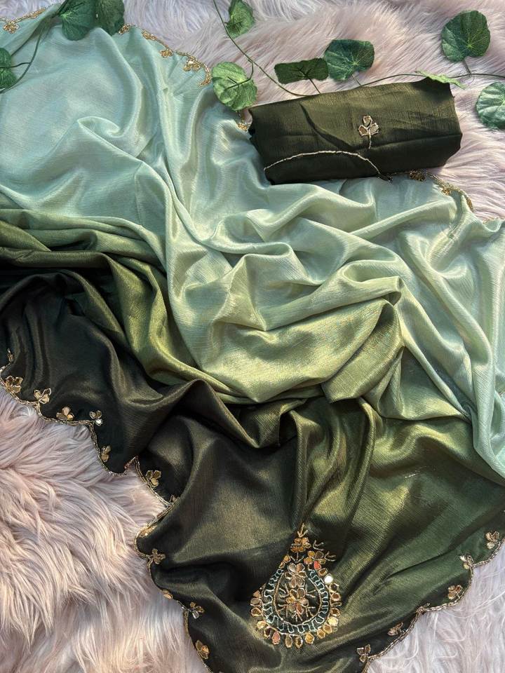 Everyday Office Party Special Hand Block Printed Multi Stone & Diamond Work Two Tone Color Chinon Silk Saree Blouse for Ladies