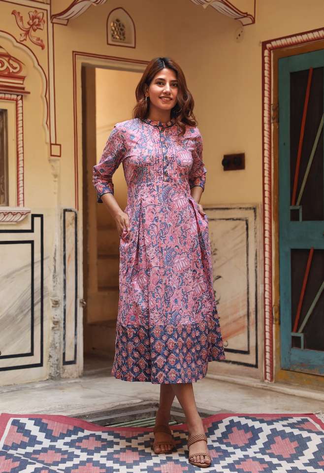 Hand Block Printed Priyanka Dress Bohemian A Line Calf Length Rose Blue Cotton