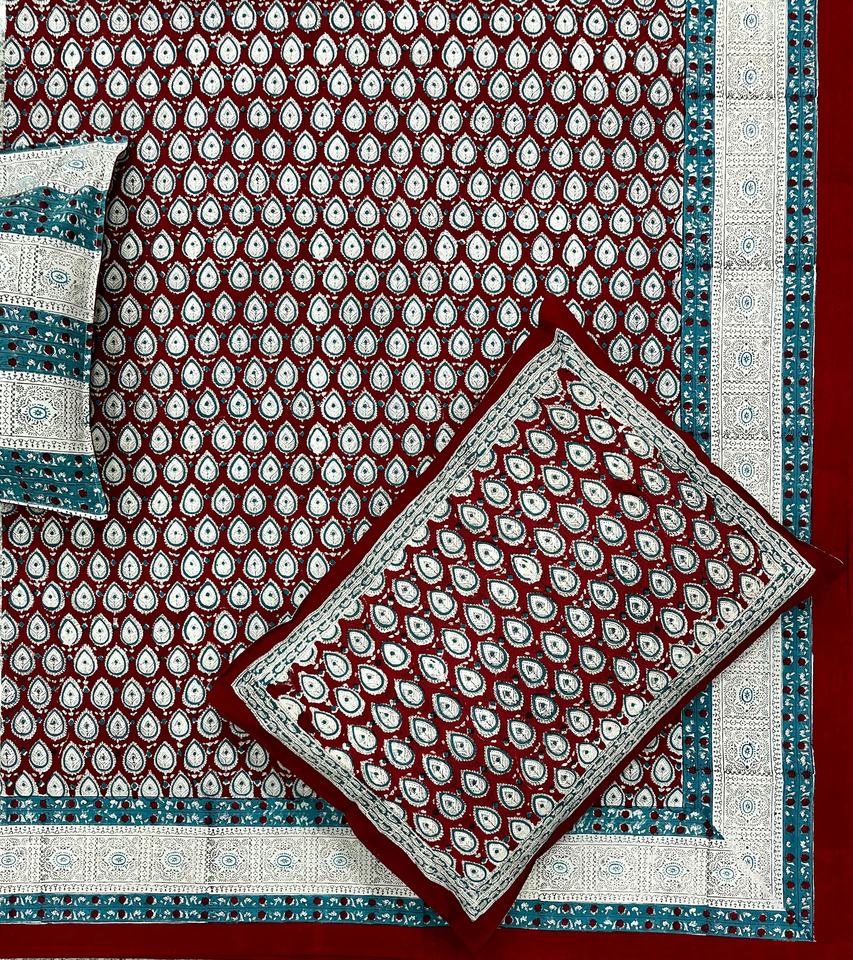 Hand Block Printed Pure Cotton Dark Red Bed Sheet Set Indian Print Bedding Set King Size (108"*108") Jaipur Luxury Boho bedsheet
