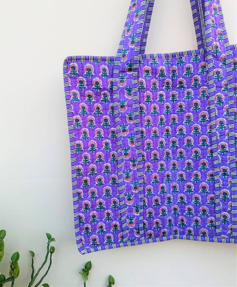 Hand Block Printed Quilted Cotton Shoulder Bag Women's Indian Handmade Shopping Tote with Zipper Closure for Winter and Spring