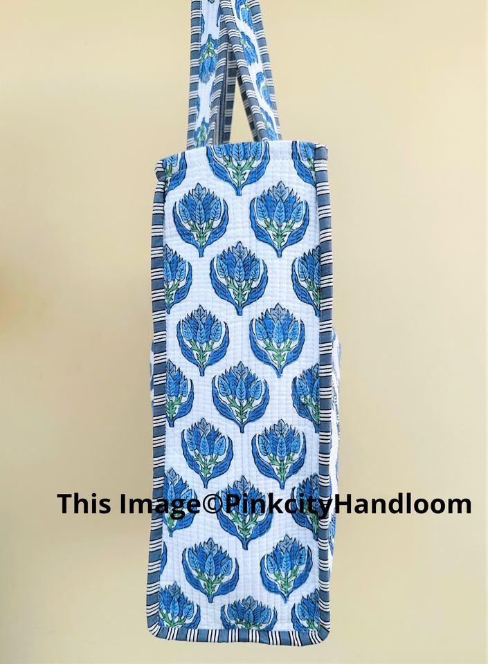 Hand Block Printed Quilted Tote Bag for Women Shopping Shoulder Beach Bag Customized Bag With Zipper