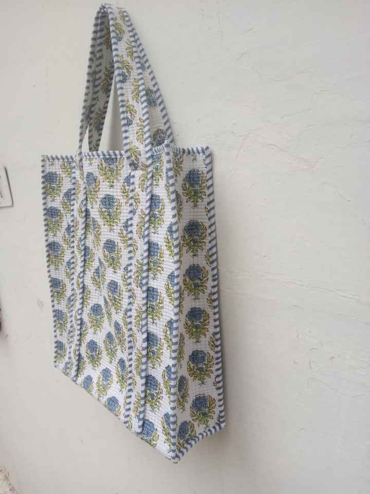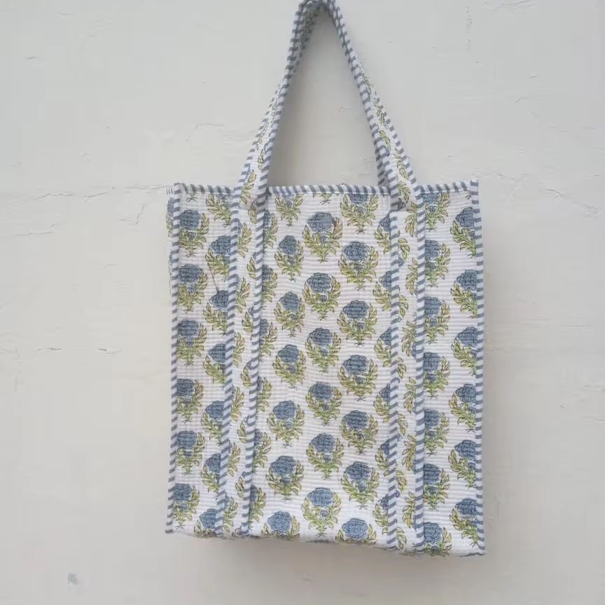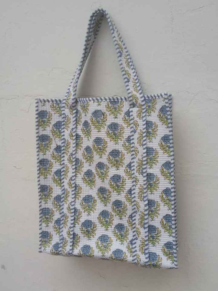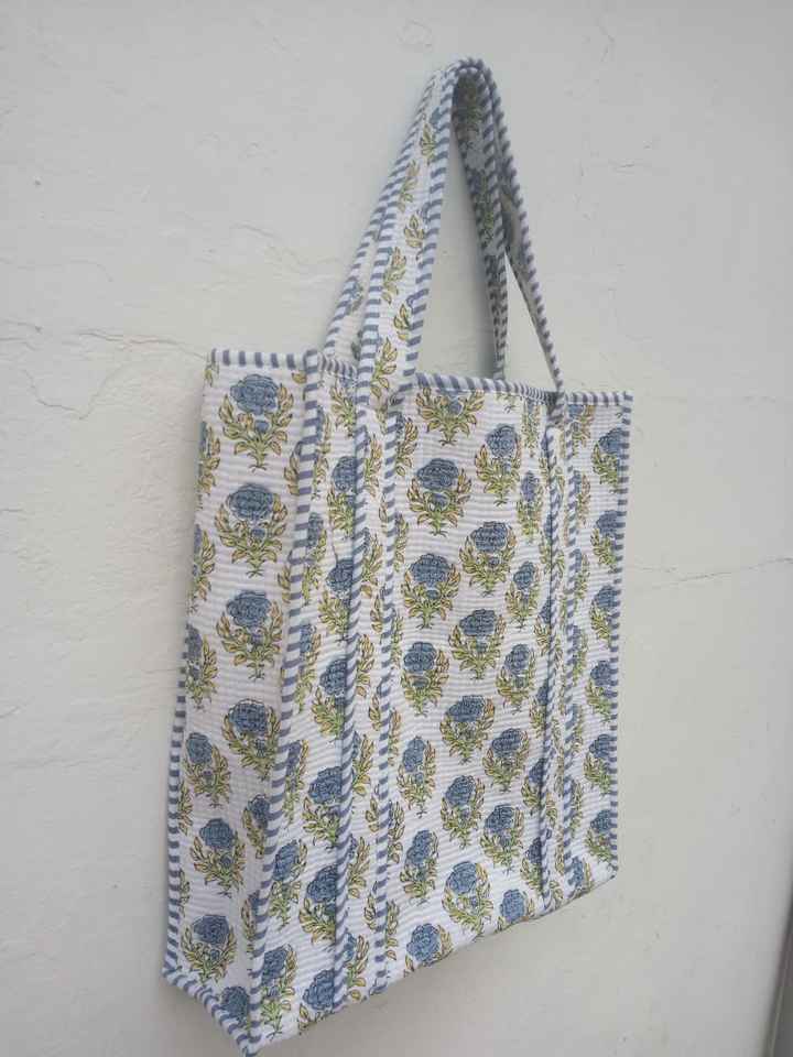 Hand-Block Printed Quilted Winter Tote Shopping Bag From India Multi-Color Floral Design Two Shoulder Straps Lining Wholesale