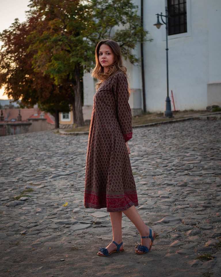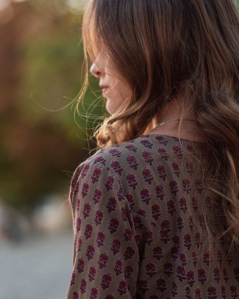 Hand Block Printed Reena Dress Bohemian Calf Length Floral Brownish Grey Maroon Handmade