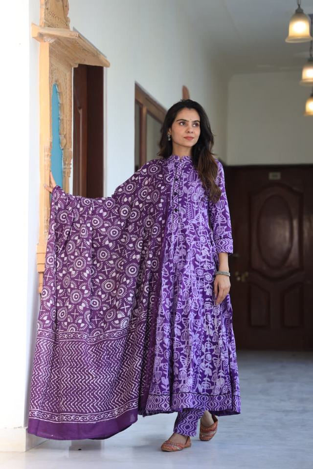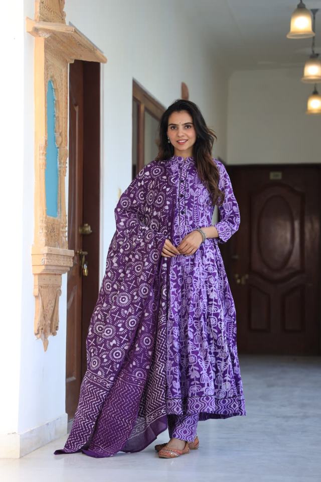 Hand Block Printed Cotton Traditional Anarkali Set Knee-Length Top Pallu Matching Dupatta Party Comfort for Diwali Festivities