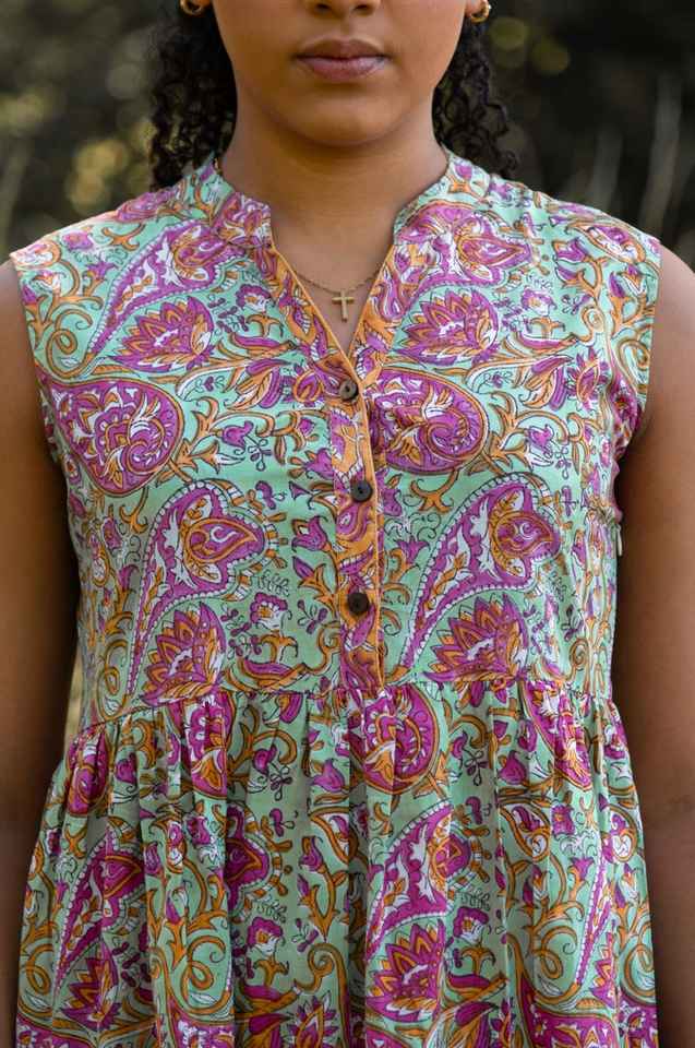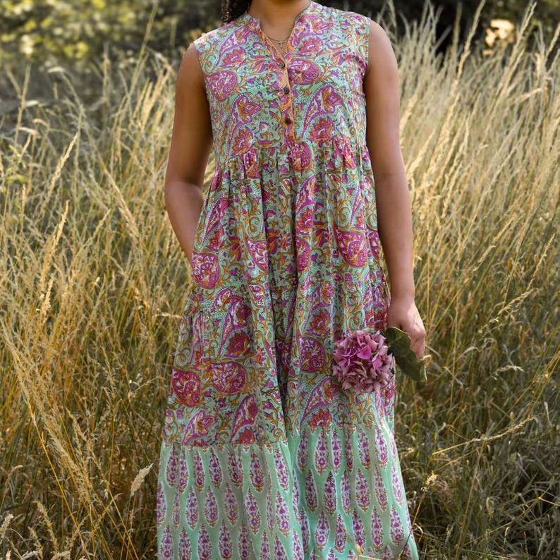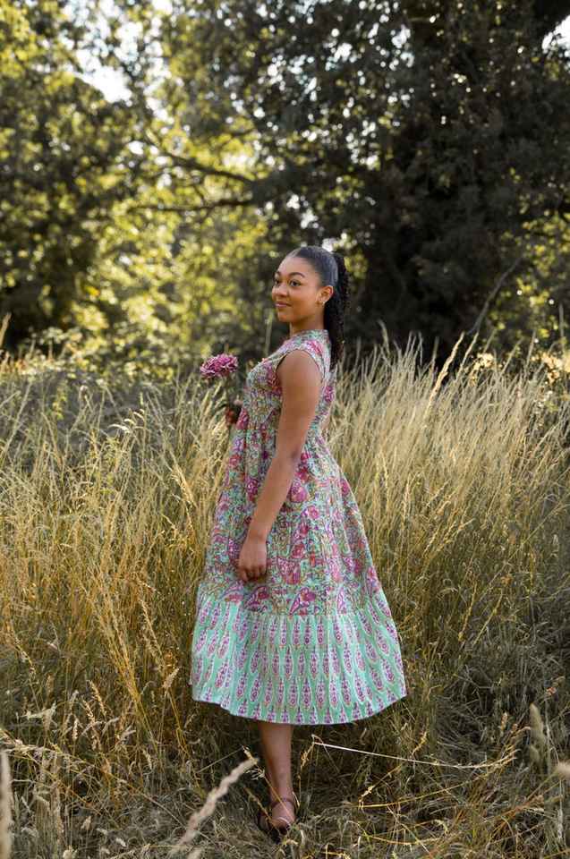 Hand Block Printed Vivienne Dress A Line Calf Length Pure Cotton Bohemian Spring Summer Ethical Fashion