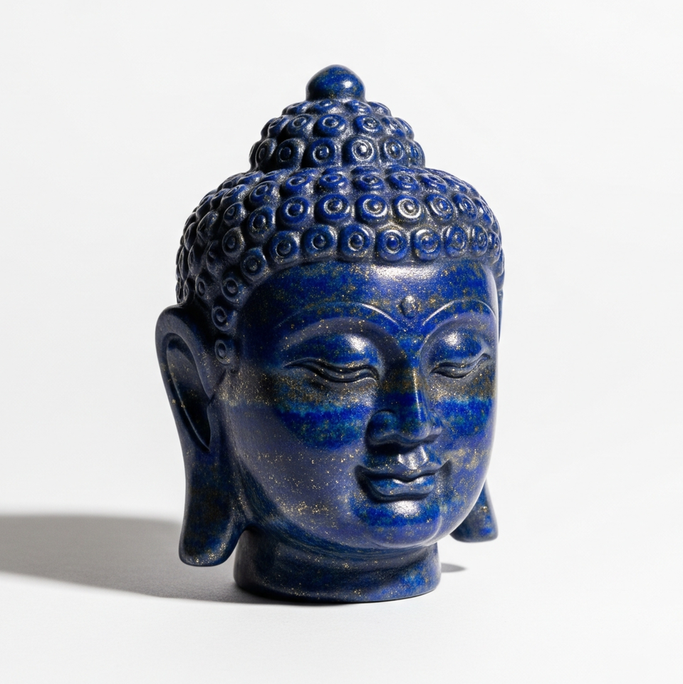 Hand-Carved Buddha Head Statue Indian Craft Figurine with Lapis Lazuli Semi-Precious Gemstone Business Healing Crystal Stone