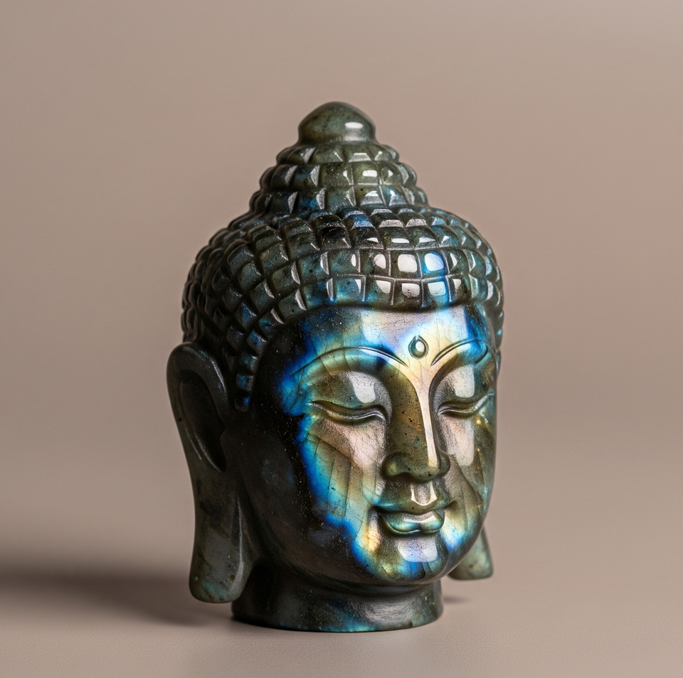 Hand-Carved Business Gift Buddha Head Statue Figurine Labradorite Semi-Precious Gemstone Craft Engraved India Healing Crystal