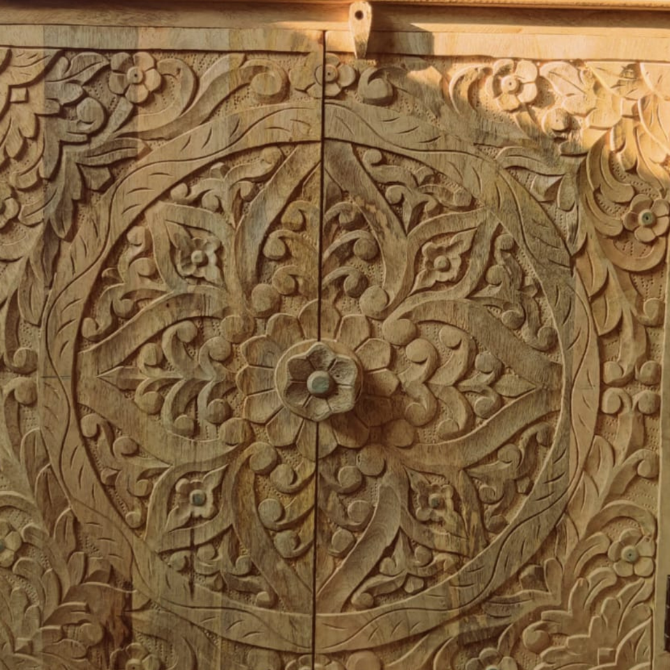 Hand Carved Floral Wooden Cabinet with Double Doors for Living Room Storage