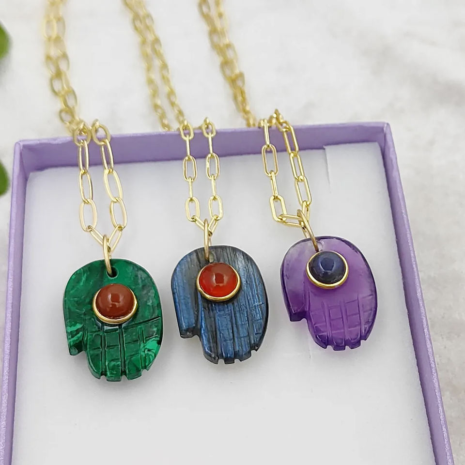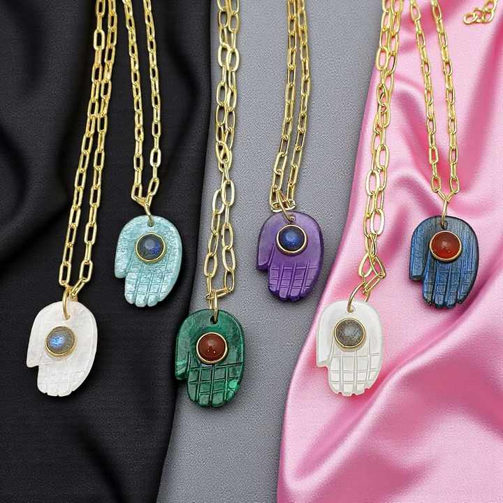 name or words:Gemstone Hamsa Hand Pendant Necklace Gold Plated Evil Protection Indian Wholesale Jewelry Bulk Supplier Hand Shape Necklaces