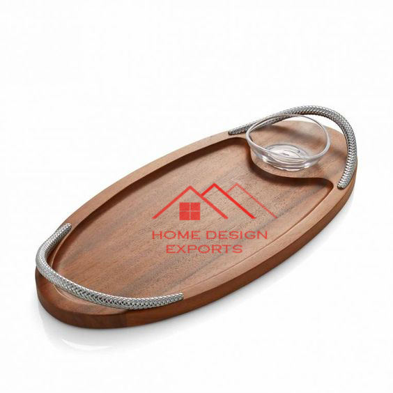 Hand Carved Wooden Food Serving Tray With Metal Handle