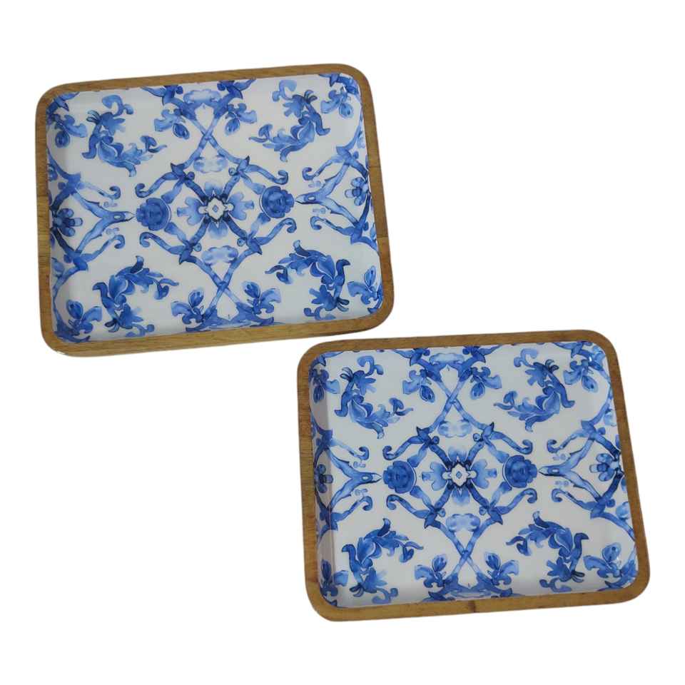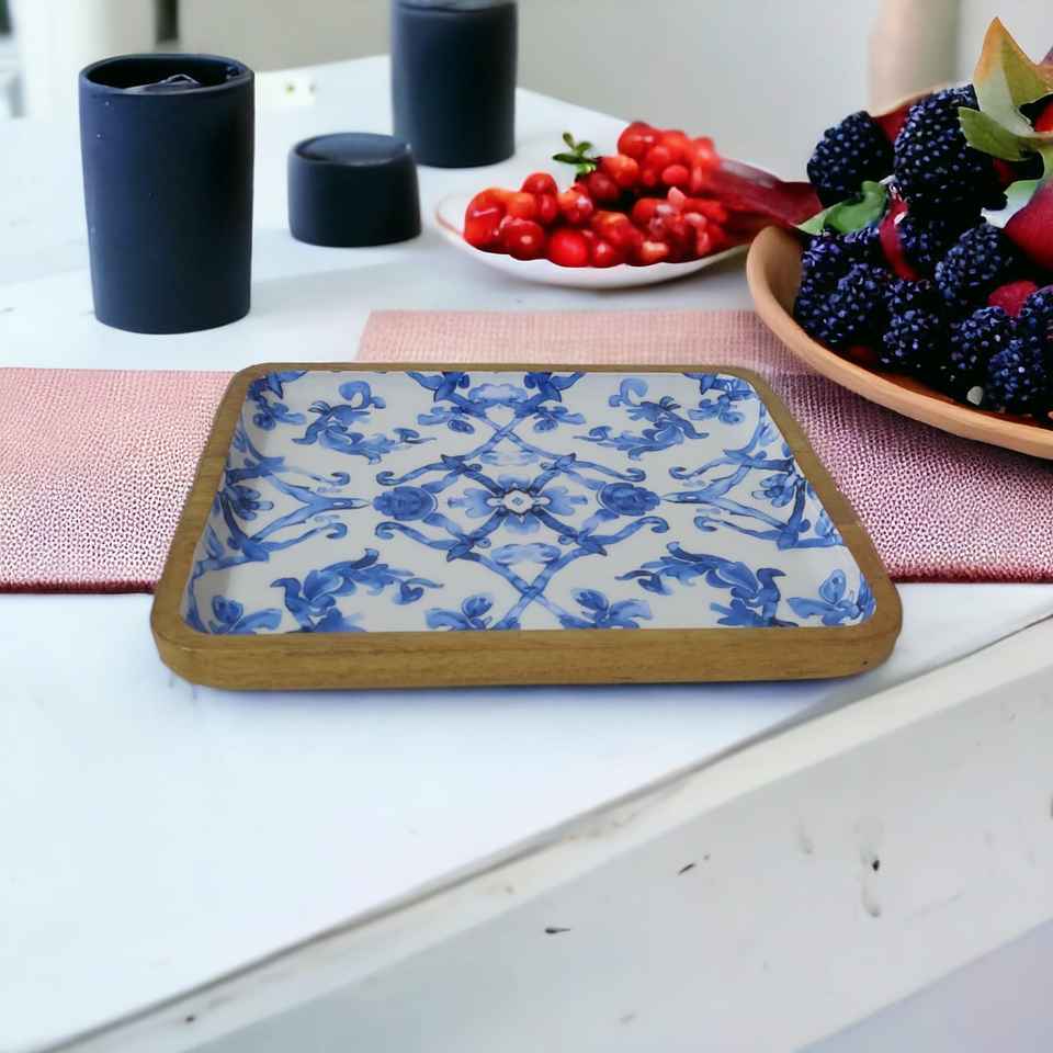Hand-Crafted Mango Wood Square Decorative Serving Platters Natural Brown Artisanal Resin Christmas White Blue Enamelled