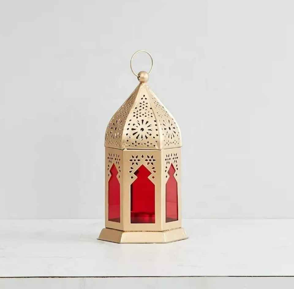 Hand Crafted Gold Lantern Square Base Red Glass Panel Intricate Dome Top Perforated Floral Pattern Hanging Ring Candle Ambient